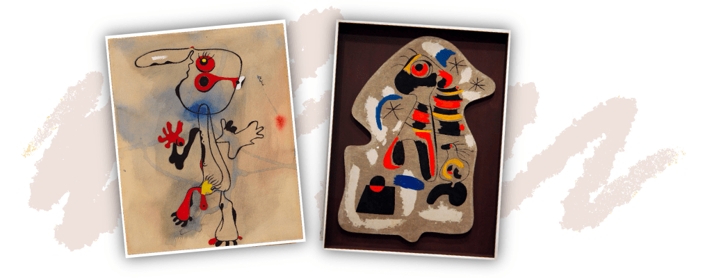 Miró’s pieces are abstract, relying primarily on 2D shapes and lines. His work is consistent with other surrealist pieces made during the early 20th century, when the style was gaining steam. The forms in Miró’s artwork include imaginary shapes as well as recognizable ones, reflecting a state of unconsciousness. Additionally, the dynamic hues and lines in Joan Miró’s work bring a fun rhythm to his art.