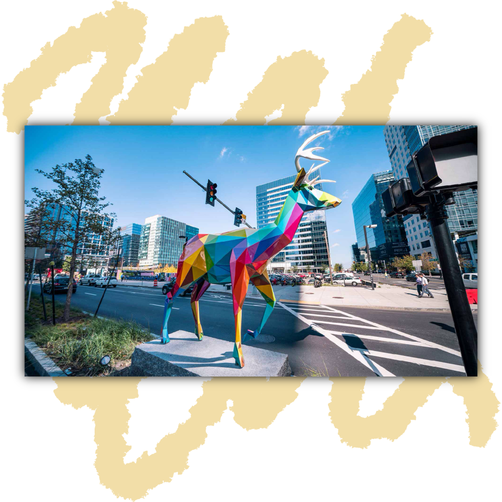 This project for Seaport Boston features seven colorful sculptures, most of which depict animals, a common theme in Egyptian art. The sculptures are made up of triangular pieces joined together to form a jewel-like figure. The themes behind this vibrant installation include the intersection between the human world and animal kingdom and the story of life, both of which are also themes in ancient Egyptian art.