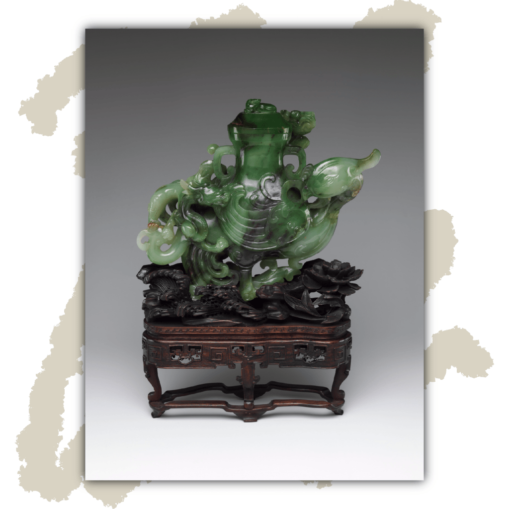 In ancient China, jade was highly valued as it was believed to have transcendental qualities and embodied prized virtues such as wisdom and justice. The sheer beauty of the stone also made it a valuable material for jewelry and art. This vase in the shape of a heavenly rooster was made during the Qing dynasty and the term “heavenly rooster” originates from a Chinese legend about a mythical bird whose call awakens the whole world.